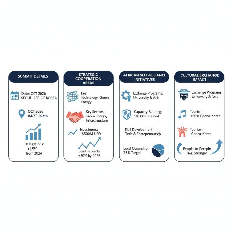 - 2026년 3월, 서울 청와대에서 열린 한-가나 정상회담은 양국 간 다방면의 협력 강화를 목적으로 진행되었습니다. 이번 정상회담은 양국의 전략적 동반자 관계를 한층 심화시키는 중요한 계기로 작용했으며, 해양 안보, 기후변화 대응, 경제 및 농업 분야를 중심으로 구체적인 협력 방안이 합의되었습니다.