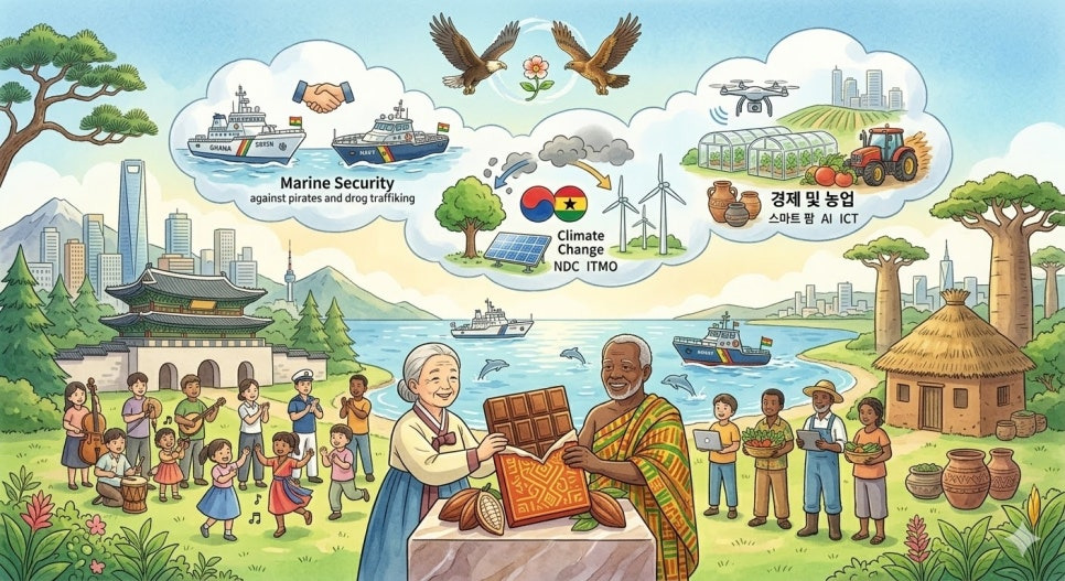 - 2026년 3월 서울에서 열린 한-가나 정상회담에서는 해양 안보, 기후변화, 경제 및 농업 분야에서의 실질적 협력 방안이 구체적으로 합의되었습니다. 존 마하마 가나 대통령은 아프리카의 보건·금융 자립을 위한 국가적 의지를 강조했고, 양국은 문화적 친밀감과 민주주의 가치 공유를 바탕으로 지속가능한 전략적 동맹 강화를 모색하였습니다. 이번 협력은 양국 모두에게 상호 윈윈 효과를 제공하며 지역적·국제적 영향력 확대의 기반이 될 것입니다.