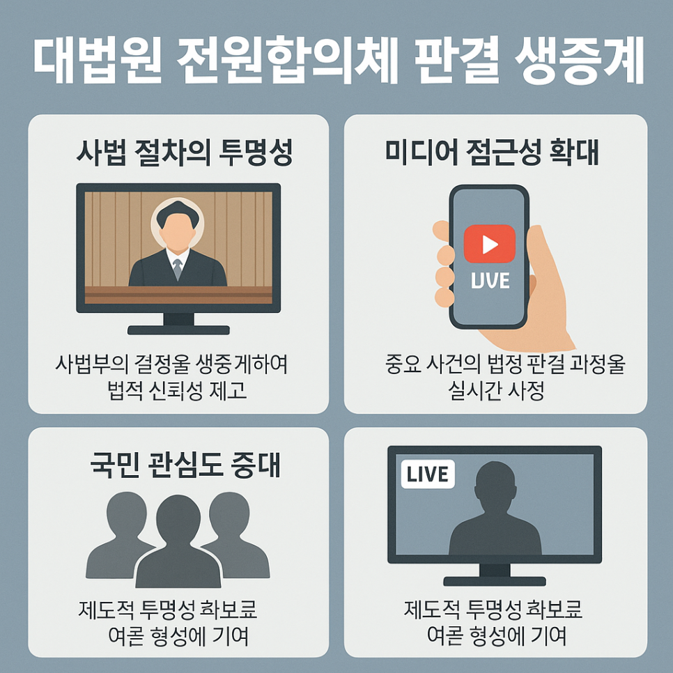- 대법원이 이재명 더불어민주당 대선 후보의 공직선거법 위반 사건에 대한 전원합의체 판결을 생중계하기로 결정한 것은 사법 절차의 투명성을 크게 향상시키는 조치로 평가됩니다. 생중계는 대중에게 판결 과정을 실시간으로 보여주며, 이는 공정한 판단을 위한 중요한 요소입니다. 일반 시민이 법원의 결정을 더욱 가깝고 실제적으로 느낄 수 있게 하여 법적 신뢰를 증대시키는 효과가 있습니다.