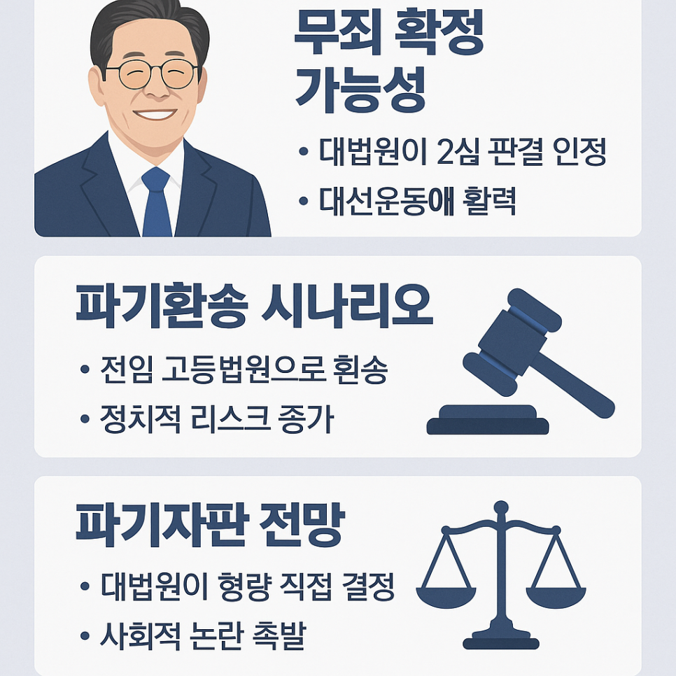 - 현재 많은 법조 인사들은 파기환송 가능성을 낮게 보고 있으며, 대신 상고기각이나 파기자판의 가능성에 보다 무게를 두고 있다. 파기환송이 결정될 경우, 이는 사건의 불확실성을 재차 연장하는 결과를 초래하게 되며, 특히 대선 경선에 임박한 시점에서 이 후보에게 추가적인 사법적 부담을 가중시킬 수 있다.