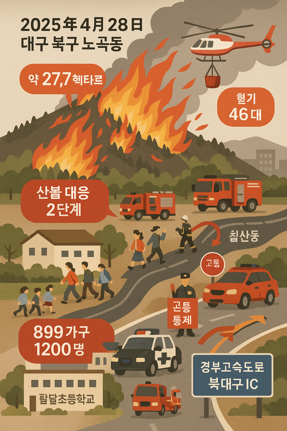 - 이번 산불로 인해 총 899가구, 약 1200여명이 대피하였습니다. 대피소로는 인근 팔달초등학교가 주요 대피소로 지정되어 있으며, 신속한 대피를 위해 대구시는 공지와 안전 안내를 더욱 강화하고 있습니다.