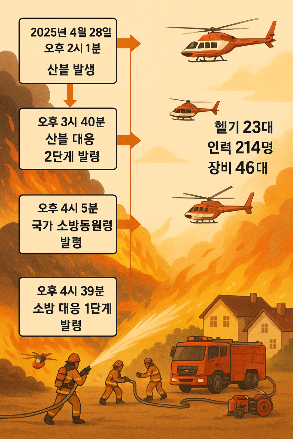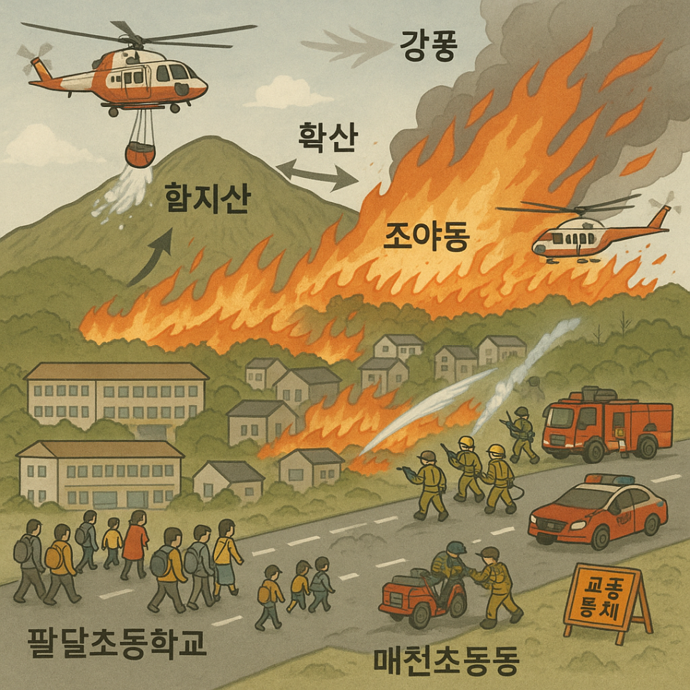 - 헬기 투입: 산불 진화 작업을 지원하기 위해 소방 당국이 공중에서 물을 살포하는 장비입니다. 이번 진화 작전에서는 헬기 23대가 활용되고 있습니다.