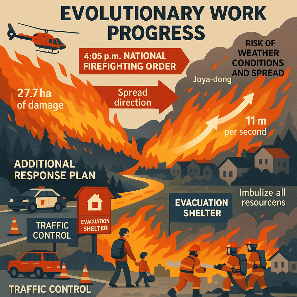 - 산불 대응 2단계: 산불의 피해 상황이 심각하게 진행될 때 발령되는 대응 체계로, 대규모 소방 인력이 투입되어 긴급 진화 작업을 실시합니다. 해당 단계는 2025년 4월 28일 오후 3시 40분에 발령되었습니다.