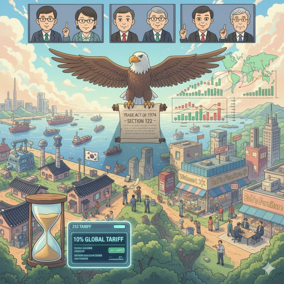 - 2026년 2월, 미국 대법원의 IEEPA(국제경제비상권한법) 기반 관세 무효 판결 이후 트럼프 행정부는 법적 공백을 메우기 위한 새로운 관세 전략으로서 10% 글로벌 관세 도입을 선언하였습니다. 이는 기존 관세 정책의 틀을 전환하는 동시에, 행정부가 여전히 무역정책을 주도할 수 있음을 대내외에 분명히 하는 조치입니다. 특히 이 정책은 최대 150일간 유효한 무역법 1974년 제122조(Section 122) 권한을 근거로 시행되면서 제한된 기간과 세율이라는 법적 한계를 갖고 있습니다.