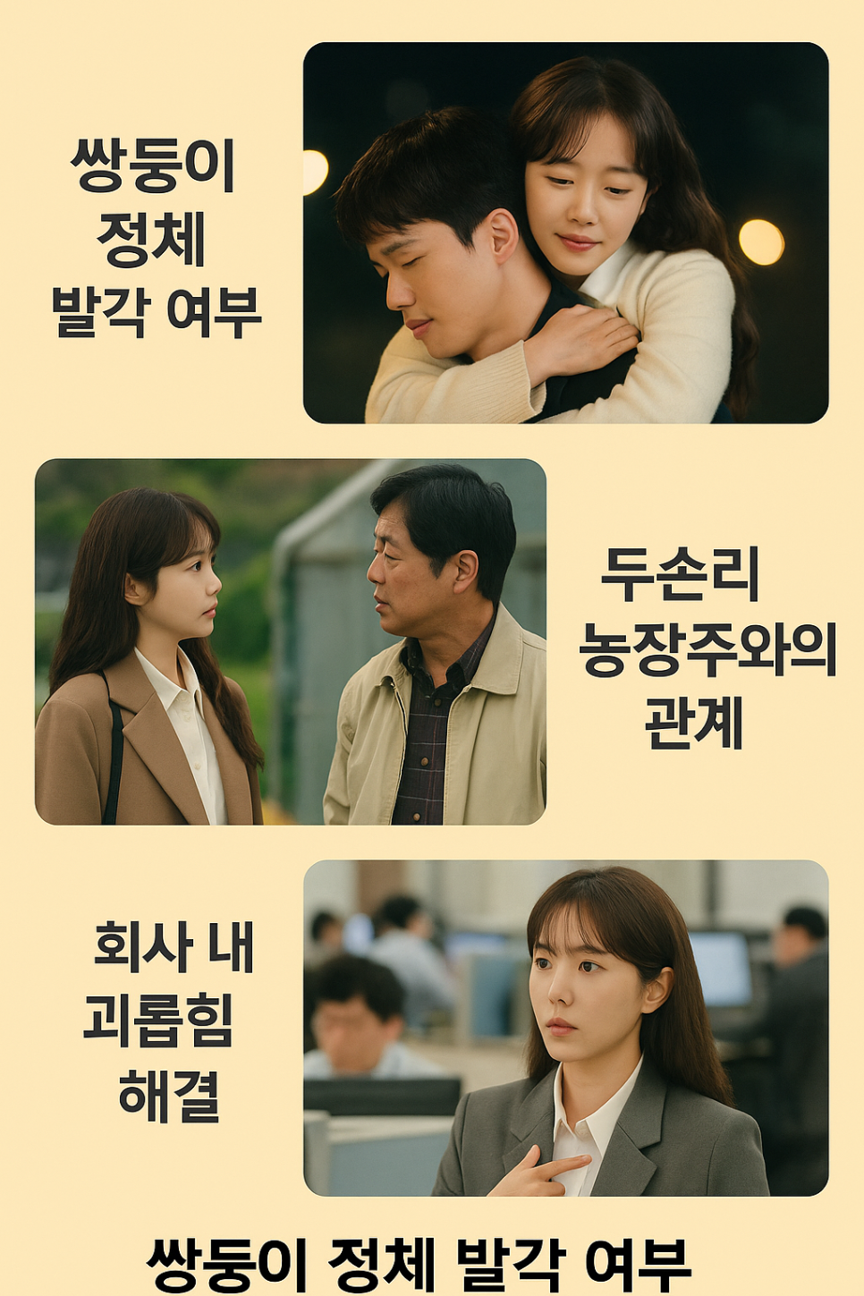 - 6-2. 주요 내용: 쌍둥이 정체 발각 여부, 두손리 농장주와의 관계, 회사 내 괴롭힘 해결 전개