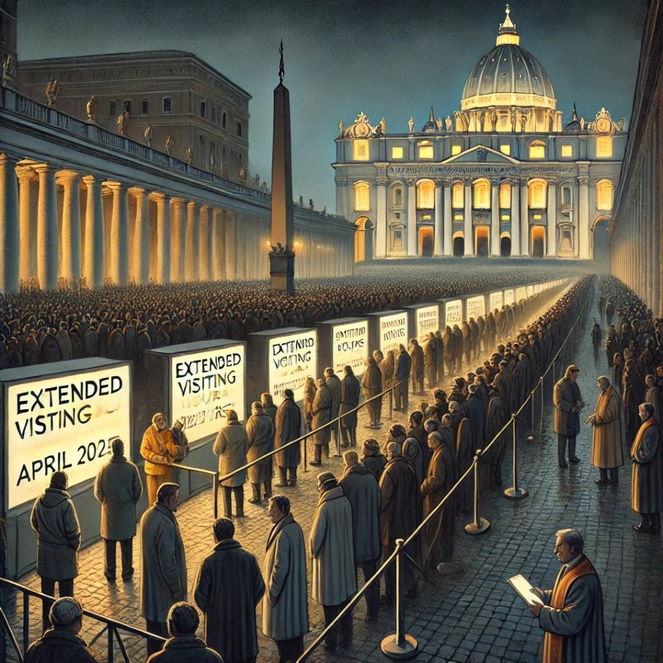 - 현재 조문에 참여하고 있는 신자 수가 기대 이상으로 많아, 교황청은 조문 시간이 자정까지로 계획되었으나 초과 인원에 대해 자정 이후에도 대성전을 개방하는 방안을 검토하고 있습니다. 4월 23일 기준으로 조문객들은 평균 최소 4시간 이상 대기해야 하며, 이로 인해 많은 이들이 조문 시간을 기다리는 상황입니다. 에이피(AP) 통신에서는 당일 10만 명 이상의 신자가 대기 중이라고 보도했습니다. 이러한 반응은 교황에 대한 깊은 애도와 경의를 표하는 신자들의 마음에서 비롯된 것이며, 교황청은 이러한 대규모의 애도행렬을 확인하고 조문 연장 여부를 적극적으로 고려하고 있습니다.