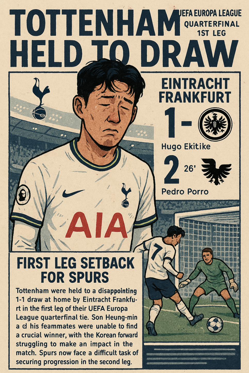 - 토트넘 홋스퍼는 2024-25 UEFA 유로파리그 8강 1차전에서 아인트라흐트 프랑크푸르트와 1-1로 비겼습니다. 이 경기는 토트넘이 집에서 열린 만큼, 기대를 모으던 경기였습니다. 하지만 예상치 못한 무승부는 팀에게 부담을 안겨주었으며, 이는 준결승 진출에 큰 위협 요소가 됩니다. 프랑크푸르트는 빠른 시간에 선제골을 기록하여 토트넘을 혼란에 빠뜨렸는데, 이는 토트넘의 강력한 공격력을 고려했을 때 다소 예상치 못한 결과였습니다. 손흥민을 포함한 주전 선수들이 기대에 미치지 못하며, 팀 전체의 사기가 저하될 수 있는 상황입니다.