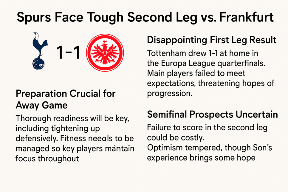 - 이번 경기의 결과는 토트넘으로 하여금 오는 4월 18일에 있을 2차전에서 분명한 반전을 이끌어내야 하는 과제를 안겼습니다. 이번 1차전에서의 무승부는 경기력의 향상이 없는 한 준결승 진출에 큰 부정적 요소로 작용할 것이므로, 팀은 향후 전략 조정과 선수들의 개인 기량 향상에 집중해야 할 것입니다.