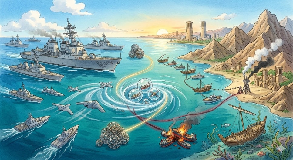 - 선박 호송 계획: 미국 및 연합군이 호르무즈 해협 등 전략 해역에서 상선 및 유조선을 보호하기 위해 수행하는 군사적 호송 임무를 일컫습니다.