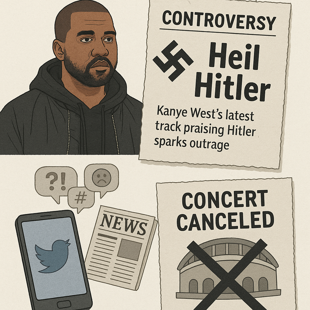 - 2025년 5월 8일, 칸예 웨스트는 아돌프 히틀러를 찬양하는 곡 'Heil Hitler'를 발표하였습니다. 이 곡은 히틀러의 연설 일부와 ‘내 친구들은 다 나치야. 히틀러 만세’라는 가사를 포함하고 있으며, 역사적 맥락으로 볼 때 매우 논란이 될 수 있는 요소들로 가득 차 있습니다. 특히, 이 곡의 출시일이 유럽 2차 세계대전 전승 기념일이라는 점에서 그 상징성은 더욱 커집니다. 한국에서의 내한 공연이 예정되어 있었던 이 뮤지션은 이러한 곡 발표로 인해 사회적 비난에 직면하게 되었고, 결국 공연이 취소되는 상황에 이르게 됩니다.
