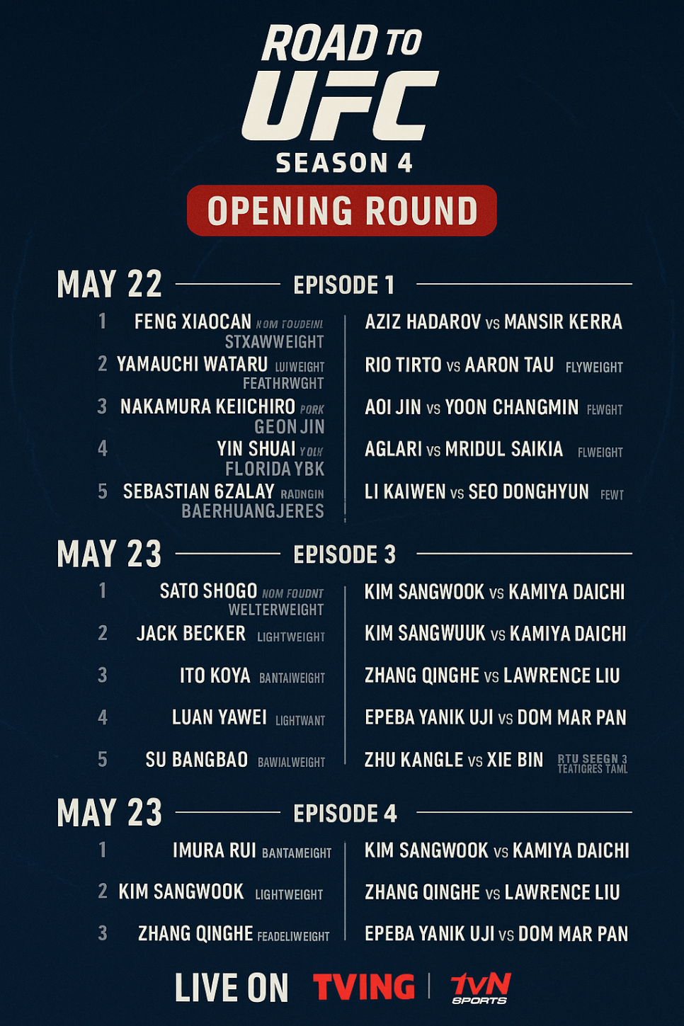 - ROAD TO UFC 시즌4의 오프닝 라운드는 5월 22일과 23일 이틀에 걸쳐 진행됩니다. 첫날인 22일에는 플라이급과 페더급의 경기가 펼쳐지고, 이틀째인 23일에는 밴텀급과 라이트급 경기가 이어집니다. 각 체급에서 우승한 선수는 UFC 계약이라는 큰 기회를 얻게 됩니다.