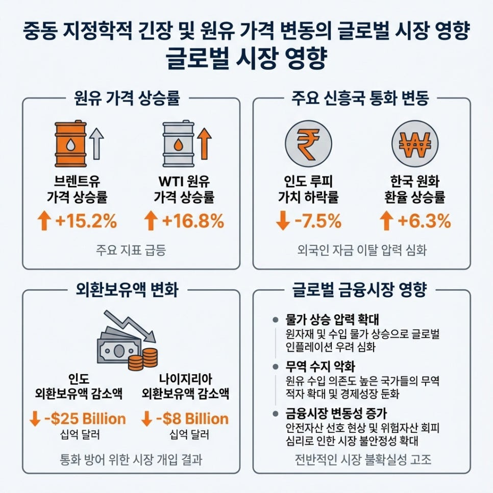 중동 지정학적 긴장으로 인한 원유 가격 급등은 인도, 한국, 나이지리아를 포함한 주요 신흥국 통화 약세에 결정적인 촉매 역할을 했습니다. 원유 가격 상승은 주요 원유 수입국들의 외환 수요 증가와 수입 비용 상승으로 이어져 무역수지 악화를 심화시키고, 이는 다시 통화 약세 압력으로 전이되었습니다.