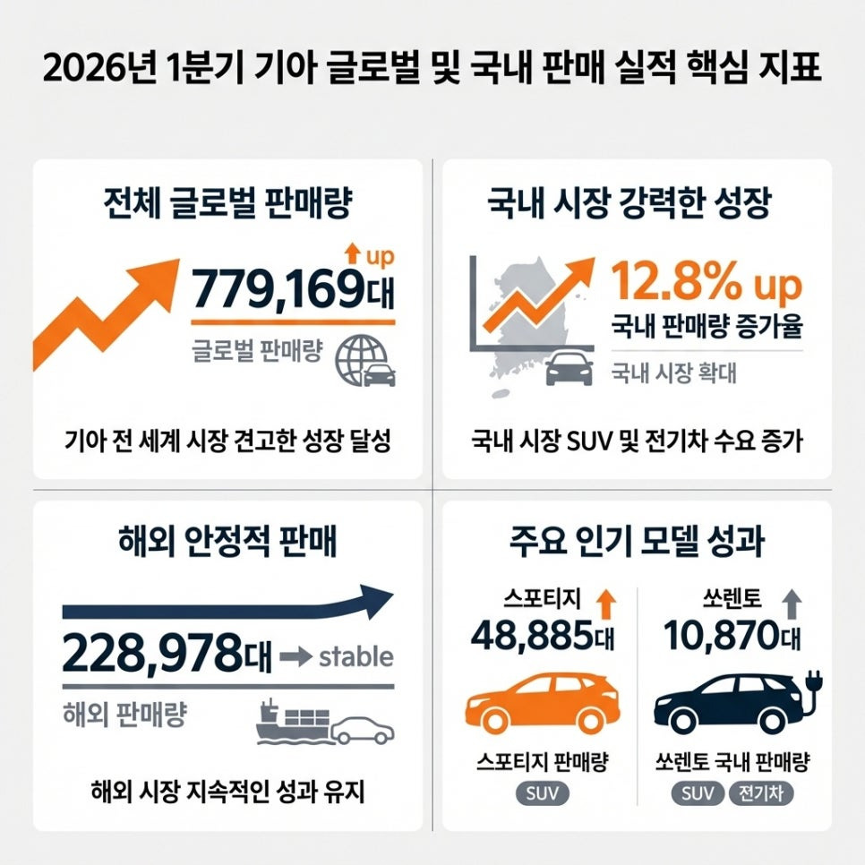 2026년 1분기, 기아는 국내외 시장에서 역대 최대 분기 판매 기록을 경신하며 글로벌 자동차 시장에서 확고한 입지를 다졌습니다. 총 77만 9,169대라는 판매량은 전년 동기 대비 의미 있는 증가를 나타내며, 특히 국내와 해외 시장 모두에서 고른 성장세를 보였습니다. 이러한 성과는 이후 섹션에서 심층적으로 다루는 지역별 및 차종별 동향 분석의 토대가 되며, 본 섹션은 전체 보고서의 시작점에서 핵심 실적과 그 전략적 의미를 집중적으로 전달합니다.