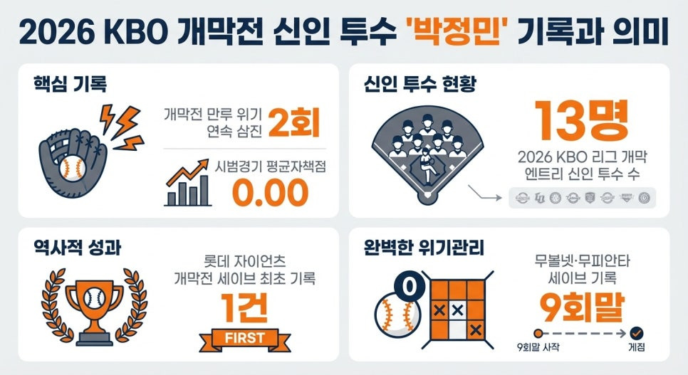 2026 KBO 리그 개막전에서 롯데 자이언츠 신인 불펜 투수 박정민 선수는 만루 위기 상황에서 연속 삼진으로 팀 최초의 개막전 세이브라는 대기록을 세웠습니다. 이 기록은 신인 투수로서 매우 이례적이며, 그의 성장 가능성과 팀 내 불펜진의 중요성을 재조명하는 계기가 되었습니다.