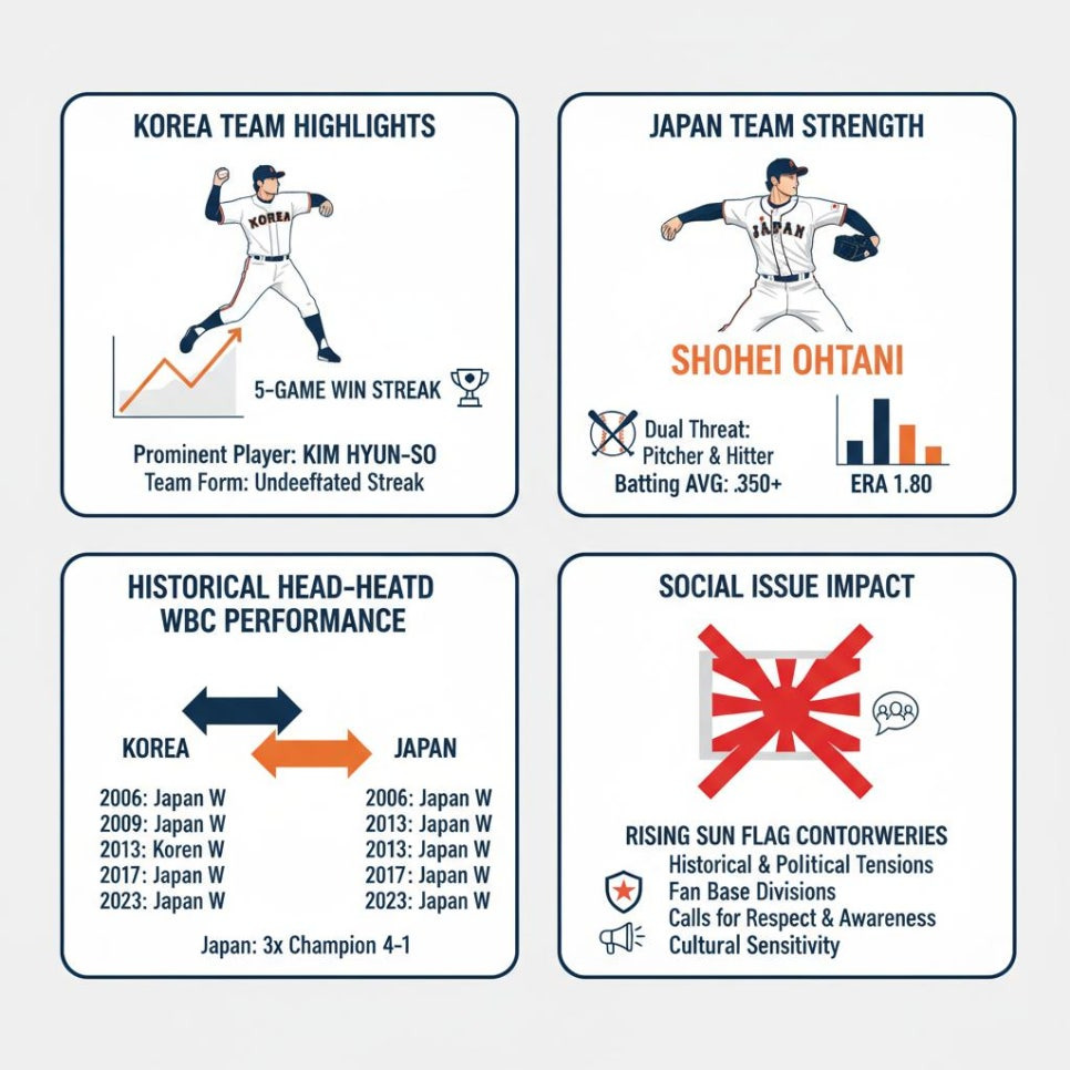 - 2026년 월드베이스볼클래식 한일전과 관련하여, 한국 대표팀은 강력한 공격력과 안정된 경기력으로 우승 경쟁에서 유리한 위치를 확보하고 있습니다. 일본 대표팀은 오타니 쇼헤이를 중심으로 탄탄한 전력을 갖추고 있으며, 도쿄돔 홈구장 이점을 최대한 활용하는 전략을 구사 중입니다. 동시에 일본 측 일부 팬들의 욱일기 응원 시도에 대한 철저한 대응이 요구되며, 공정하고 평화로운 경기 환경 조성을 위한 긴밀한 협력과 정책적 노력이 절실합니다.