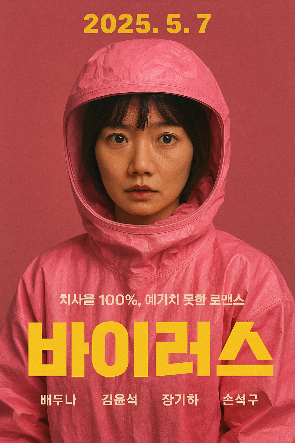 - 2025년 4월 1일, 영화 '바이러스'의 제작사 바이포엠스튜디오가 5월 7일로 개봉일을 확정하고 1차 포스터를 공개했습니다. 이 포스터는 영화의 주인공인 택선(배두나)이 핑크색 보호복을 입고 있는 모습이 담겨 있으며, 그녀의 상기된 얼굴과 함께 "심박수 증가, 자신감 상승, 도파민 폭발"이라는 독특한 감염 증상 문구가 눈길을 사로잡습니다. 포스터에는 택선과 얽히는 세 남자, 연구원 수필(손석구), 동창 연우(장기하), 치료제 개발자 이균(김윤석)의 모습도 함께 담겨 있어 관객의 호기심을 자아냅니다. 이는 영화의 중심 소재인 '톡소 바이러스'가 불러일으키는 감정 변화와 캐릭터 간의 복잡한 관계망을 암시하고 있습니다.