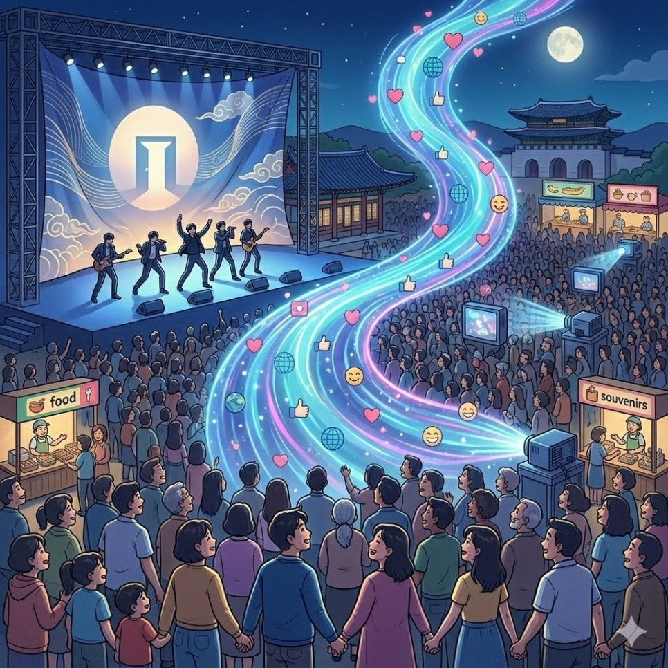 - 이 행사는 넷플릭스를 통한 190여 개국 글로벌 생중계로 전 세계 팬들과 공유되었으며, 이는 한국 대중문화의 국제적 확산과 경제 활성화에 중요한 기여를 하였습니다. 공연이 한국 관광과 지역 경제에 미친 긍정적 파급 효과와 더불어, 향후 지속 가능한 문화·관광 정책 방향 수립에도 의미 있는 시사점을 제시합니다.