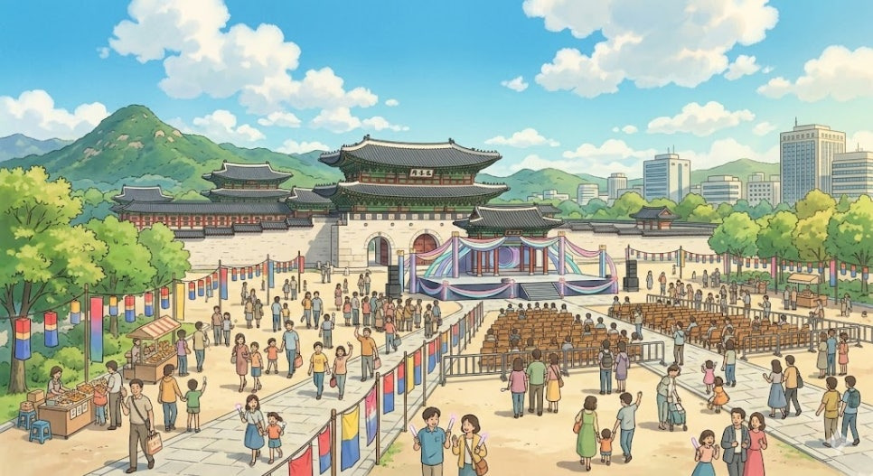 - 경복궁: 1395년에 건립된 조선 왕조의 법궁으로, 조선 시대 왕권과 국가 정체성을 상징하는 역사적 왕궁입니다. 공연 동선에 포함되어 전통과 현대가 만나는 공간으로 활용되었습니다.