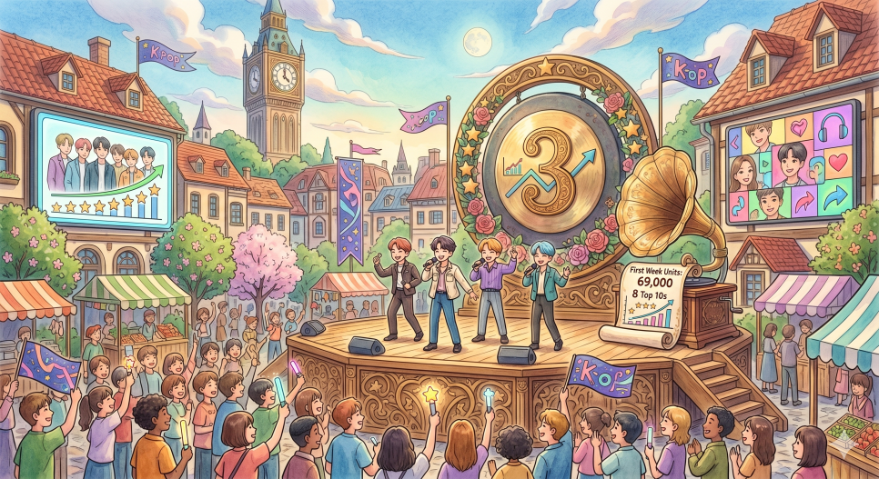 TXT의 ‘7th Year: A Moment of Stillness in the Thorns’ 앨범은 미국 빌보드 200 차트에서 3위로 데뷔하며 강력한 존재감을 과시했습니다. 첫 주에 약 6만 9천 장의 등가 앨범 단위(equivalent album units)를 기록하며, 이는 실물 음반 판매, 디지털 앨범 판매 및 스트리밍 데이터를 통합한 수치입니다. 이러한 기록은 TXT가 미국 시장에서 꾸준히 쌓아온 팬덤과 음악적 완성도의 결실로 해석됩니다.