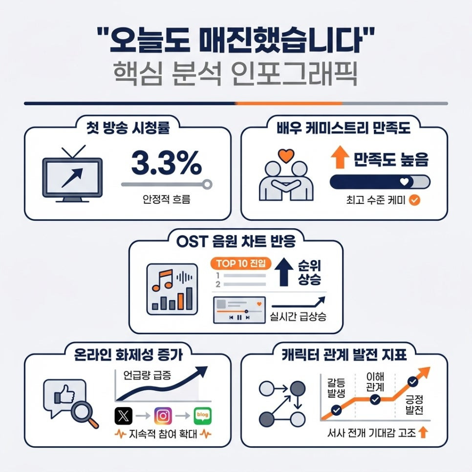 SBS 수목드라마 '오늘도 매진했습니다'는 주연 배우들의 뛰어난 캐릭터 케미스트리와 첫 방송 시청률 3.3%라는 안정적인 성과를 바탕으로 성공적인 출발을 알렸습니다. 두 캐릭터 간의 조화로운 상호작용과 신선한 소재 활용이 시청자의 몰입을 견인하며, 동시간대 경쟁작 가운데 안정적인 위치를 점한 점이 주목됩니다.
